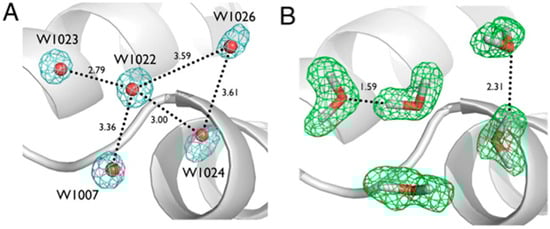 Even with the highest resolution X-ray structures, it remains difficult to visualize H atoms due to their low Z and proximity to heavier atoms, and as such, it is difficult to accurately model H bonding networks. In the case of crambin there is a 0.48 Å resolution crystal structure of crambin available in the PDB (3NIR), and also the recently collected 0.38 Å X-ray diffraction data set [,]. Even in these extraordinary cases it was still only possible to observe around two-thirds of all H atoms in the Fo − Fc difference maps. Inferring H atom positions and the H bonds they may be involved with can be misleading, as exemplified in the study of crambin (Figure 2A,B). There are five ordered water molecules seen in ultra-high resolution X-ray crystal structures of crambin with very well-defined oxygen atom positions but no definitive information on location of the H (or D) atoms. The dashed lines in Figure 2A indicate putative H bonds between these waters. Further inspection of the nuclear density maps showed that there are in fact only two H bonds between these waters (Figure 2B), and not five as can be interpreted based on the X-ray data alone. By taking advantage of the high resolution of the data, together with the strong neutron scattering exhibited by D atoms, it was possible to model the anisotropic vibrational behavior of a selected number of D atoms in crambin. Qualitatively, the D atoms were on average more anisotropic than their bonded, neighboring heavy atom [].