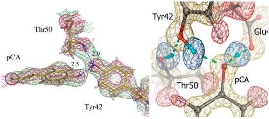 Nuclear density maps around the pCA of PYP. (Left) H bonds around the pCA in PYP as observed in the 2.5 Å structure []. Reproduced with permission from the International Union of Crystallography; (Right) High resolution neutron studies to 1.5 Å enable accurate determination of H/D atom positions and assignment of LBHB in PYP. Figure reproduced from [].