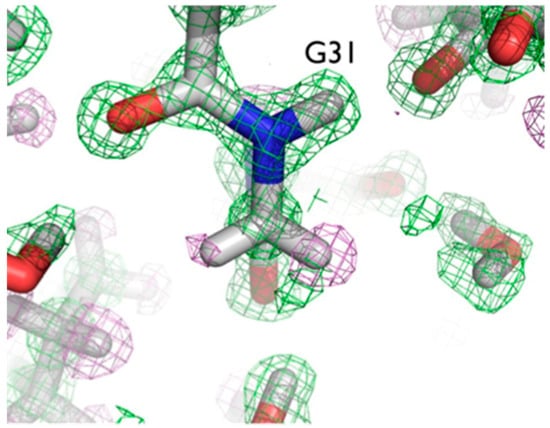 The ultra-high resolution (1.1 Å) of the crambin neutron structure made it possible to clearly resolve H atom positions and the degree of exchange with D []. More accurately than in other neutron structures resolved to date, the relative occupancies of H/D at exchangeable positions could be refined, and solvent molecules and side chains could be identified and oriented. Of note were two particular regions of the protein with unexpected characteristics. In Gly31, the two Hs appear to have different degrees of exchange, based on the observed nuclear density for the two H atoms (Figure 6).