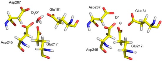 Atomic details of metal binding site M1 using neutrons at two different pHs. (Left) Coordination of hydronium ion D3O+ located in metal site M1 at pH 7.7 (from PDB ID 3kcj); (Right) Coordination of proton D+ located in metal site M1 at pH 5.9 (from PDB ID 3qza).
