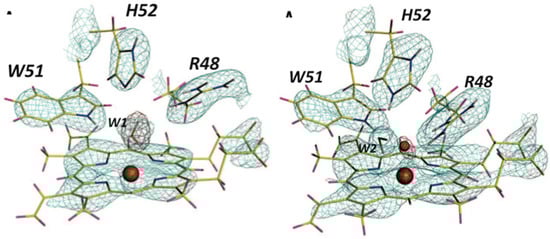 Neutron crystal structures of cytochrome c peroxidase in the ferric and Compound I form. (Left) nuclear density maps show that a heavy water, D2O, is bound to the heme; (Right) nuclear density maps show that oxygen is bound to the heme in the Compound I intermediate form. Figure reproduced from [].