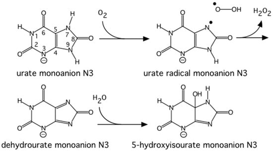 The reaction catalyzed by urate oxidase. Figure reproduced from [].