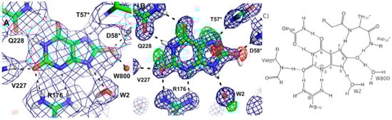 Another neutron study investigated the drug methazolamide (MZM) bound to HCA II []. MZM is a methyl derivative of AZM and has superior properties in terms of shelf life, stability, and is less water-soluble than AZM, making it better suited for use in glaucoma treatment. Unsurprisingly the data showed that MZM was also unprotonated on the sulfonamide moiety and has similar coordination to the zinc as AZM (Figure 16B). MZM displaced a total of seven water molecules, compared to four by AZM. Three of the water molecules are common between the two structures. This means that in the AZM complex there are still a number of ordered, H bonded water molecules that are absent in the room temperature MZM complex. In the MZM situation there is an enthalpic trade-off that involves the breaking of so many H bonds to expel the waters, this balances the entropic gain of releasing water to the bulk solvent. This explains why the Ki for HCA II of MZM is still very similar as AZM (i.e., ~10 nM). The added methyl group on the thiadiazole group of MZM disrupts the water-mediated H bond that was observed between AZM and Thr200 and Pro201 [,]. Detailed knowledge of H bonds and water networks in ligand binding is valuable and neutron crystallography will have increasing importance in rational drug design that can exploit this knowledge. Having quantitative information on H bonds can be used for example to modify or derivatize compounds to introduce compensatory interactions or to produce a desired ionization form of the ligand.