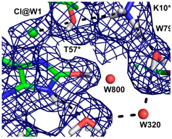 The postulated proton relay chain as seen in the 2mFo-DFc nuclear density map. Figure reproduced from [].