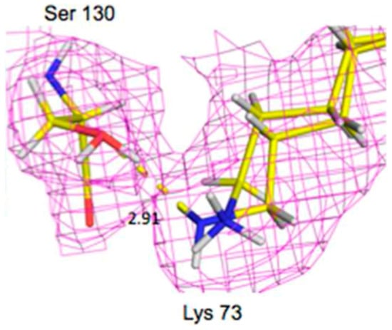 Lys73 is highly conserved in class A β-lactamases and has been thought to act as general base, in competition with Glu166, by abstracting a proton from Ser70. The ability of E166A mutant to still produce the acyl-enzyme complexes, which supports the idea that Lys73 is involved, albeit less effectively than Glu166. In the ligand-free neutron structure, it is seen that Lys73 is charged (-D3+) and occupies a single conformation that is identical to that observed in the form where Glu166 is present. In the cefotaxime-complex structures however, Lys73 is observed in two alternative conformations that refine to near equal occupancy, presumably due to different charged states (Figure 13). These observations together support a role for Ly73 in proton transfer and represents a viable alternative pathway when Glu166 is mutated [].