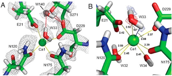 The catalytic calcium ion is involved in 7-fold coordination, with a solvent molecule bound in the active site pocket. While X-ray structures were not able to discern the species of the solvent molecule, the neutron structure revealed it to be a water molecule, and not a hydroxyl, ascertained by the elongated nuclear density and Fo − Fc omit maps (Figure 14B) []. This unambiguously showed that the mechanism did not involve direct water activation by the calcium ion, as had been previously suggested by other investigators, but was consistent with the Asp229 in the role as nucleophile. Of note was the orientation of the bound water (D2O) molecule in relation to the position of the catalytic calcium ion, with a very close distance (2.08 Å) between one of the D atoms of the water and the calcium ion, and a Ca-O-D angle of 53 degrees.
