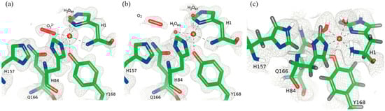 Cu-binding site and coordination in different crystal structures of LPMO from Neurospora crassa. (a) X-ray structure of crystal treated with ascorbate, peroxo (O22−) bound; (b) X-ray structure of crystal treated with ascorbate, molecular oxygen (O2) bound in “pre-bound” position; (c) neutron structure with His157 modeled as neutral and pointing at “pre-bound” position. Figure reproduced with permission from [].
