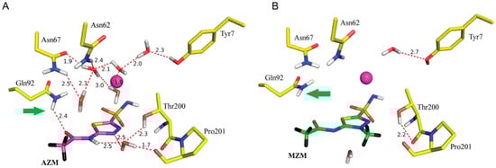 Comparison of AZM and MZM binding and water displacement as observed in neutron crystallographic studies. (A) AZM complex; (B) MZM complex []. Figure reproduced, with permission from the International Union of Crystallography from [].