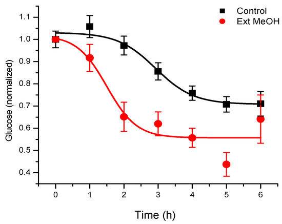 Hypoglycemic effect of damiana methanolic extract on adult CD1 mice. Dosage of 0.5 mg/kg administered intraperitoneally. n = 5, Mean ± standard error (SE).