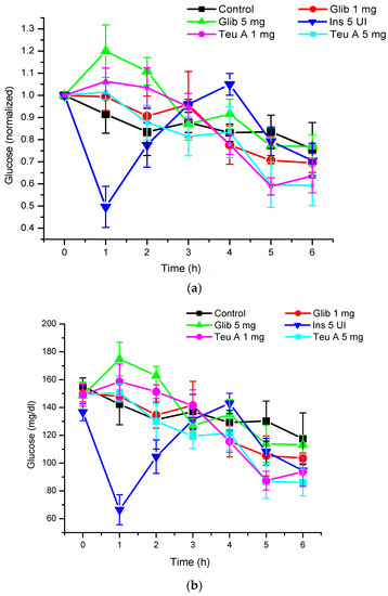 Hypoglycemic effect of insulin, glibenclamide, and teuhetenone A in adult CD1 mice. Glib - glibenclamide; Teu A - teuhetenone A; Ins - insulin. n = 5, Mean: ±SE. (a) Graph with normalized values; (b) Graph with unnormalized values. Standardized blood glucose for baseline glycemia to compare the kinetics of each experimental group.