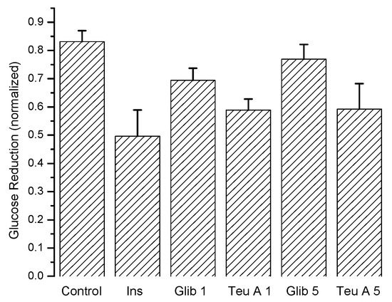 As seen in Figure 3, although the hypoglycemic activity of teuhetenone A and insulin appeared similar, the observed kinetics for both compounds were very different. While insulin reached a reversible maximum hypoglycemic activity one hour after administration, the decrease in glycemia with teuhetenone A was gradual and did not reverse for at least six hours after administration, potentially maintaining an “antidiabetic” effect for longer and thereby reducing the frequency of administration required for long-term control of glycemia.