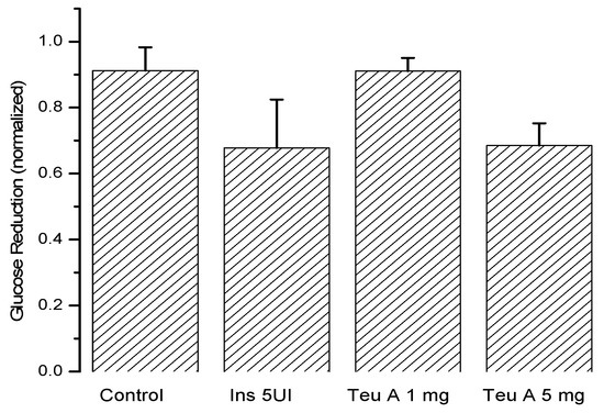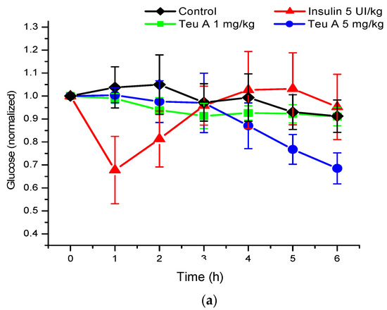 Under the experimental conditions used, levels of glycemia were decreased by about 20% for six hours of fasting in CD1 mice treated with a vehicle control, and 40% after administration of teuhetenone A intraperitoneally, with no difference in the doses evaluated (1 and 5 mg/kg). Under the same conditions, insulin at 5 IU/kg had a hypoglycemic activity of 50% (Figure 3).