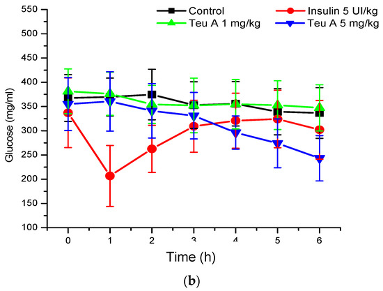 Antidiabetic effect of insulin and teuhetenone A in diabetic mice induced with 200 mg/kg of alloxan. n = 5, Mean ±SE. (a) Graph with normalized values; (b) Graph with unnormalized values. Standardized blood glucose for baseline glycemia to compare the kinetics of each experimental group.