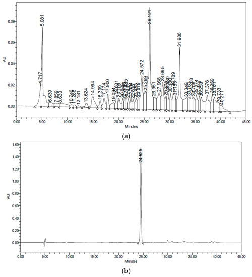 (a) Chromatogram of the original extract of T. diffusa, conditions as in text; (b) Chromatogram of teuhetenone A.