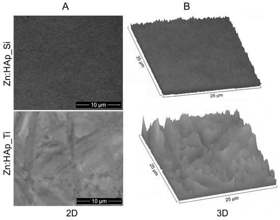 Figure 4 illustrates the surface micrographs (Figure 4A) and 3D surface plots (Figure 4B) of Zn:HAp_Si and Zn:HAp_Ti coatings dried for 60 min at 100 °C and thermally treated in air for 60 min at 300 °C.