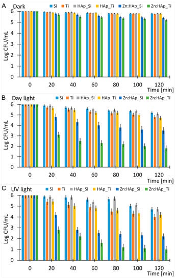 Survival curves of C. albicans on Ti, HAp_Ti, Zn:HAp_Ti, Si, HAp_Si, and Zn:HAp_Si substrate in the dark (A), exposed to day light (B) and UV light (C).