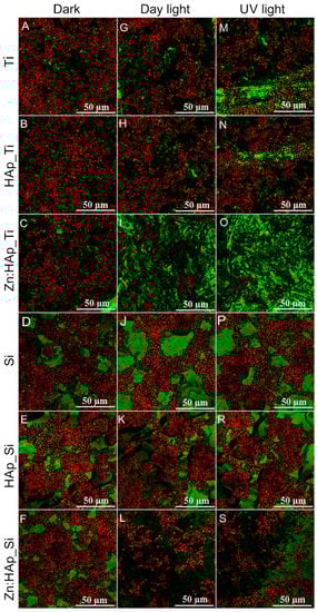 The adhesion of C. albicans cell on different surfaces (Ti, HAp_Ti, Zn:HAp_Ti, Si, HAp_Si, and Zn:HAp_Si) after exposure to daylight and UV light and when kept in the dark at 37 °C was analyzed by CLMS (Figure 6). A large number of surviving cells on Ti and Si substrate, on HAp_Ti, HAp_Si layers and on the Zn:HAp_Ti and Zn:HAp_Si layers were observed (Figure 6A–F). On the other hand, when the HAp_Ti, HAp_Si layers were exposed to daylight or UV light a slight influence was observed in reducing the number of surviving C. albicans cells. Nevertheless, in none of these cases can we speak of an antifungal effect, even though after exposure to daylight or UV light the cellular proliferation was lower. Furthermore, it can be seen that the antifungal behavior of HAp_Ti (Figure 6B,H,N) and HAp_Si (Figure 6E,K,R) layers is similar to that of the Ti and Si substrates (Figure 6A,E,I,D,J,P). Though, the number of surviving cells on HAp_Ti, HAp_Si layers decreased after exposure to daylight or UV light, this effect was not noticed in terms of CFU/mL (Figure 5). This behavior might suggest that HAp_Ti and HAp_Si layers had a temporary and reversible effect against the proliferation of C. albicans cells. The number of surviving cells on Ti and Si substrate and on the Zn:HAp_Ti and Zn:HAp_Si layers decreased when the samples were exposed to daylight (Figure 6G–L) and UV light (Figure 6M–S). In comparison, fewer surviving cells of C. albicans were found on Zn:HAp_Ti (Figure 6I,O) and Zn:HAp_Si (Figure 6L,S) samples. On the other hand, for Zn:HAp_Ti and Zn:HAp_Si samples, it can be seen that the number of surviving cells decreased when the samples were exposed to UV light (Figure 6O,S).
