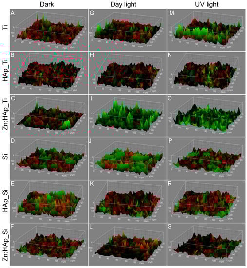 The 3D composite images analyzed using Image J software [] presented in Figure 7 displays the structure and spatial distribution of C. albicans surviving cells on different surfaces (HAp_Ti, Zn:HAp_Ti, HAp_Si, Zn:HAp_Si, Ti and Si) kept in the dark and after exposure to day light and UV light. The images exhibited in Figure 7 reveal the spatial distribution of C. albicans surviving cells (red color) along horizontal (coverage) and the vertical (thickness) distributions on Ti, PDMS, HAp-PDMS, Zn:HAp-PDMS and Ag:HAp-PDMS surfaces. The CLSM images presented in Figure 7 demonstrated that the survival of C. albicans cells have been significantly reduced in the presence of Zn:HAp_Ti layers (Figure 7I,O) depending on the light. A decrease of C. albicans surviving cells depending on the light exposure was also observed in the presence of Zn:HAp_Si layers (Figure 7L,S).