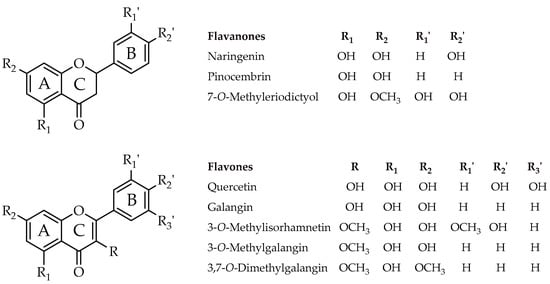 The antibacterial activity in solid media was determined by the agar overlay method [41]. Bacteria grown overnight in LB-broth were diluted to McFarland 0.5 (2 × 108 colony forming units (cfu)/mL), and a portion of this diluate (100 μL) were mixed with molten soft agar (0.7%, 3 mL) at 55 °C. The soft agar was poured over Petri dishes containing 1.5% agar (20 mL). Two-fold dilutions of the rest samples (5 μL) in methanol were deposited over solidified agar, starting at 1 at 0.08 μg/μL (galangin, 3-O-methylgalangin, and 3,7-O-dimethylgalangin), to 4 at 0.03 μg/μL (quercetin, naringenin, 7-O-methylisorhamnetin, 3-O-methyleriodictyol, and pinocembrin). After 18 h of incubation at 37 °C, the diameter of the inhibition zone was determined. Control measurements were carried out with methanol. The maximum stock concentration used (1 and 4 mg/mL) is related to the more or less activity shown by the compounds; the exception was for 3-O-dimethylgalangin, whose stock concentration was the same as the most related compounds. The minimum inhibitory concentration corresponded to the minimum concentration that showed a transparent halo of growth inhibition. The MIC determination was carried out in three independent experiments.