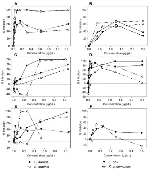 The inhibitory activities of all flavonoids were also tested in liquid media in a 96-well microdilution test at different final concentrations, and only some representative examples are shown in Figure 2. The graphs show the relationship between the maximal growths determined as the optical density reached by each bacteria in the presence of different compound concentrations. Gram-positive bacteria showed a higher susceptibility than Gram-negative bacteria.