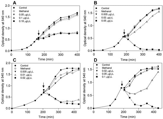 Effect of flavonoids on bacterial exponential growth and viability. 10 mL E. coli (A) and B. subtilis (B–D) cultures at O.D.540 nm 0.5 (shown by the arrow) were treated with different concentrations (indicated in the figure) of pinocembrin (A,B), 3-O-methylgalangin (C), and 7-O-methyleriodictyol (D), or the cells were not treated or they were treated with methanol alone. The graphs are representative of the results of three replicates.