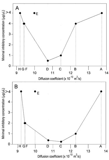 Relation between diffusion coefficient and antibacterial activity of flavonoids. (A) E. coli; and (B) B. subtilis. The compounds used were: A (3,7-O-dimethylgalangin), B (pinocembrin), C (galangin), D (3-O-methylgalangin), E (3-O-methylisorhamnetin), F (naringenin), G (7-O-methyleriodictyol), and H (quercetin), which are indicated by small uppercase letters.
