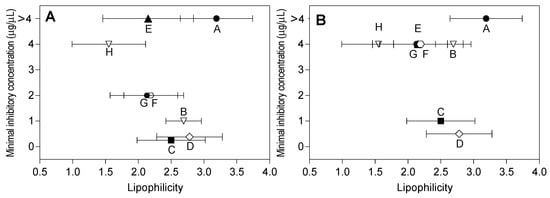 Minimal inhibitory concentration and lipophilicity relationship between flavonoids. (A) B. subtilis; and (B) E. coli. The compounds used were: A (3,7-O-dimethylgalangin), B (pinocembrin), C (galangin), D (3-O-methylgalangin), E (3-O-methylisorhamnetin), F (naringenin), G (7-O-methyleriodictyol), and H (quercetin), which are indicated by small uppercase letters.