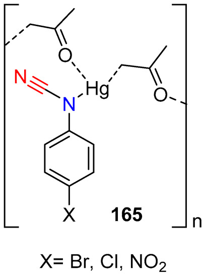 - Chiniforoshan, H.; Pourrahim, N.; Tabrizi, L.; Tavakol, H.; Sabzalian, M.R.; Notash, B. Syntheses, studies and crystal structure of new coordination polymers of mercury(II) with phenylcyanamide derivative ligands. Inorg. Chim. Acta 2014, 416, 85–92. [Google Scholar] [CrossRef]