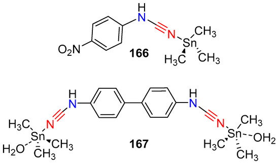 The group also reported the synthesis of trimethyltin(IV) complexes with 4-nitrophenylcyanamide and a biphenyl derivative of cyanamide ligand [83]. The complexes were obtained by mixing the trialkyl-tin with the ligand in an alkali medium (NaOH), and irradiating the mixture under high-intensity ultrasound. In these complexes the cyanamide coordinates to the metal through the nitrile nitrogen; the biphenyl derivative was found to bridge between two trimethyltin metal centers (Figure 2). All compounds showed some activity in the antimicrobial/antifungal assay, but did not exceed the efficacy of ciprofloxacin or fluconazole for antimicrobial or antifungal activity. However, the cytotoxic activity of these compounds were impressive against the HeLa cell line. Both complexes had similar efficacy in causing cell death in the MTT assay, and this was comparable to cis-platin.