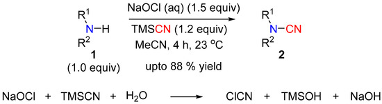 In 2014, Chen et al. used a combination of hypochlorite and TMSCN for the in situ generation of cyanogen chloride (CNCl) to accomplish the N-cyanation of a variety of secondary amines [7]. The hypochlorite oxidizes the TMSCN to release the active CNCl reagent, which then cyanates nucleophilic amines. Both dialkyl and alkyl-aryl amines were readily cyanated using this method, offering the products in good to excellent yields (Scheme 1).