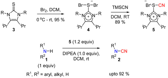 Alcarazo and co-workers have developed the thiocyanoimidazolium salt 5 as an electrophilic cyanation reagent for secondary amines [8]. Halogenation of thiourea led to the hypervalent sulfur species 4, which upon treatment with TMSCN provided the active reagent 5. In the presence of an amine base such as diisopropylethylamine (DIPEA), the reagent 5 successfully transferred the active [CN]+ to a number of alkyl and aryl sec-amines to give corresponding cyanamides in good yield (Scheme 2). The protocol was deemed to be operationally simple and wide in scope, however precaution must be taken when handling the cyanating reagent 5; just like the isolobal hypervalent iodine reagents, they show strong exothermic decomposition upon heating.