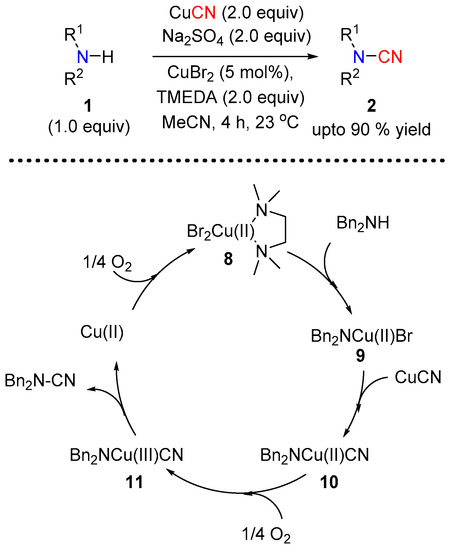 Cheng et al. developed a transition metal catalyzed cyanation of sec-amines for N–CN bond formation under oxidative coupling conditions [10], using CuCN as the source of nitrile. When used in combination with N,N,N′,N′-tetramethylethylenediamine (TMEDA), which itself was proposed to play the dual role of a ligand and a base in the catalytic cycle, molecular oxygen (O2) and sodium sulfate, the sec-amine underwent cyanation in the presence of CuBr2 (Scheme 4). The CuCN was also shown to self-catalyze the cyanation reaction when conducted in the absence of any additional copper source. Based on the experimental evidence the authors proposed the catalytic cycle illustrated in Scheme 4, where a Cu(II) species is thought to participate in the catalytic cycle.