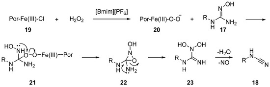 Chauhan and co-workers reported the synthesis of monosubstituted N-arylcyanamides via the oxidation of the corresponding guanidoximes in an ionic liquid (Scheme 6) [12], which is proposed to mimic the natural enzymatic oxidation of oximes to nitriles. The imidazolium ionic liquid was used as the reaction medium for the H2O2 mediated oxidation catalyzed by the water soluble anionic iron(III)-porphyrins [TAPS4Fe(III)Cl].