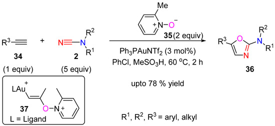 Kukushkhin et al. applied a gold catalyzed heterocyclization of alkynes with substituted cyanamides in the presence of the oxygen donor 2-picoline oxide (35), to give 2-amino-1,3-oxazoles 36 (Scheme 10) [17]. A variety of terminal alkynes 34 in the presence of Ph3PAuNTf2 and 2-picoline oxide in chlorobenzene, underwent cyclization with dimethylcyanamide to offer the 5-substitued 2-amino-1,3-oxazoles 36. The reaction was proposed to proceed through a β-gold(I)-vinyloxypyridinium intermediate 37, which is trapped by the cyanamide nitrile.