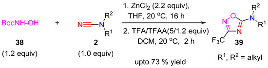 A cycloaddition protocol for the synthesis of 1,2,4-oxadiazoles 39 was developed utilizing cyanamides as core building block by Goldberg and co-workers [18]. A zinc-chloride catalyzed reverse nucleophilic addition of N-Boc-hydroxylamine (38) to the cyanamide-nitrile, followed by acylation, deprotection and ring-closure, mediated by TFAA and TFA, lead to the final cyclized 1,2,4-oxadiazole targets 39 (Scheme 11).