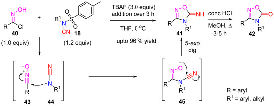 Recently, we (Sharma and co-workers) investigated the in situ trapping of a cyanamide anion 44 with 1,3-dipoles like nitrile oxide 43 for the syntheses of nitrogen rich heterocycles via a formal [3 + 2] cycloaddition [19]. Using TBAF as a reagent for both the detosylation of N-tosyl-cyanamide and the dehydrochlorination of chlorooxime, allowed the formation of both complimentary reactive species in one pot. The nucleophilic addition of the cyanamide anion to the nitrile-oxide followed by 5-exo-dig cyclization gave the oxadiazol-5-imine product 41 in excellent yields (Scheme 12). These novel heterocycles, which are useful but somewhat under-represented in pharmaceutical drugs, were further converted to the biologically relevant oxadiazol-5-ones 42 upon acidic hydrolysis. Further investigation into the reactions of cyanamide anion led to the syntheses of other novel heterocycles under trapping conditions with dipoles like nitrile imine.