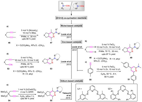 The [2 + 2 + 2] co-cyclization utilizing cyanamide was further applied by Louie et al. to access aminopyrimidines 53 [26]. The cyclization of alkenyl-nitrile 52 with cyanamide under FeI2, iPrPDAI, Zn dust in toluene gave access to the substituted pyrimidines (Scheme 13d).