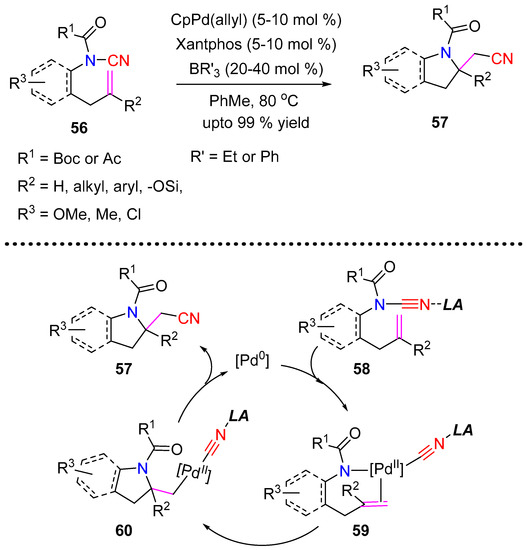 Metal catalyzed aminocyanation involves the simultaneous installment of an amino and nitrile-group on adjacent carbon atoms, commonly in unsaturated systems. Unlike its congeners, oxycyanation, carbocyanation, thiocyanation etc., the field of aminocyanation is relatively unexplored. The first example of aminocyanation via the cleavage of the N–CN bond by a cooperative palladium/triorganoboron catalysis was reported by Nakao et al. in 2014 [28]. An intramolecular insertion of N–CN into the double bond of N-cyano-N-[2-(2-methylallyl)aryl]acetamide 56 was achieved under the catalytic system: CpPd(allyl), 4,5-bis-(diphenylphosphino)-9,9-dimethylxanthene (xantphos), and BEt3. The 5-exo-trig products were obtained in good to excellent yield under elevated temperature (Scheme 14). The same authors also investigated the enantioselective aminocyanation, by replacing the xantphos ligand with an (R,R,R)-Ph-SKP ligand. A catalytic cycle was proposed, wherein the boron Lewis acid coordinated to the N–CN group 58 undergo oxidative addition to a Pd(0)−xantphos complex. Syn-aminopalladation of 59 in an exo-trig fashion followed by C−CN bond-forming reductive elimination generates the boron-bound product (Scheme 14).