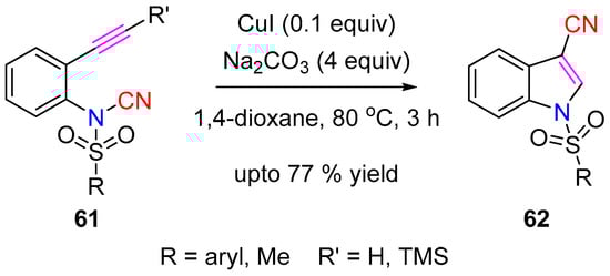 Chien and Co-workers synthesized a series of 1-sulfonyl-3-cyanoindole (62) products by CuI catalyzed intramolecular aminocyanation of N-(2-ethynylphenyl)-N-sulfonyl-cyanamides 61 (Scheme 15) [29]. In the presence of CuI and Na2CO3, both terminal ethynyl and TMS-ethynyl-N-tosylcyanamide-substituted aryl-derivatives underwent intramolecular aminocyanation across the C–C triple bond leading to the 3-cyanoindole skeleton. Based on the experimental results with internal alkynes, it was postulated that the reaction proceeds via the formation of a key Cu-acetylide intermediate.