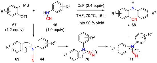 Another example of a metal-free cleavage of the N–CN bond was described by Zeng et al. [31]. The researchers demonstrated that aryne-insertion across the N–CN bond to deliver the amino benzonitriles (68) could be achieved by in situ generation of arynes 69 and an anionic species 44 from the mono-substituted cyanamide. Both of the reactive species were generated simultaneously via a fluoride ion source (CsF). The aryne underwent nucleophilic addition to give the phenyl-anion 70, which on cyclization gave the highly strained four-membered intermediate 71. Ring opening of the intermediate 71 and protonation led to the final aminocyanated product (Scheme 17).