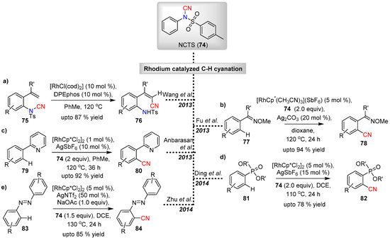 Fu and co-workers reported the syntheses of aromatic nitriles 78 under Rh-catalyzed directed C−H cyanation using NCTS as the cyanating agent (Scheme 19b) [41]. The cyanation was first developed for acetophenone O-methyl oxime substrates (77) and eventually extended to different directing groups such as pyridines, pyrazoles, dihydroimidazoles and dihydrooxazoles, which all resulted in moderate to good yields of the nitrile products. The reaction was found to tolerate a variety of synthetically demanding functional groups (e.g., unprotected phenol, Ar-I, epoxide), which proved to be challenging with other transition metal catalysts such as Pd.