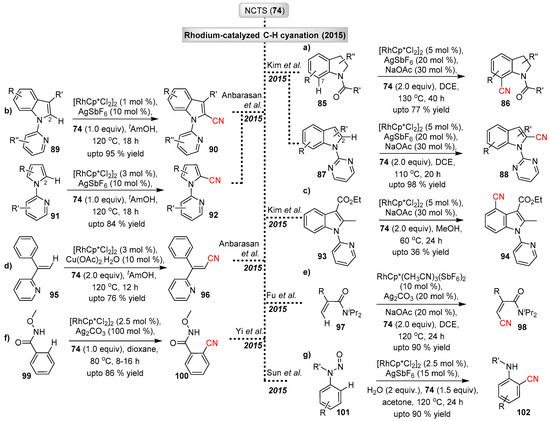 Recently Sun et al. reported the synthesis of 2-(alkylamino)benzonitriles 102 via a rhodium catalyzed aryl C−H cyanation and denitrosation of N-nitrosoarylamines 101 with NCTS (Scheme 20g) [51]. The new reaction demonstrated good tolerance to a wide range of substituents on the aryl-ring and amino-group, while delivering the corresponding products in moderate to good yields.