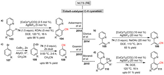 N-Sulfonyl cyanamides viz N-cyano-N-tosyl-sulfonamide (74, NCTS), also known as N-cyano-N-phenyl-p-methylbenzene-sulfonamide [33], are popular cyanamide derivatives with significant applications in synthetic chemistry. The reactivity and stereoelectronic properties of the sulfonyl group have been exploited to orchestrate diverse reactions of cyanamides; e.g., Lewis acid assisted aminocyanation [30], generation of cyanamide anion by action of a nucleophilic fluoride ion [19], electrophilic cyanation by reaction with Grignard reagents [34] as well as for heterocyclic ring construction [35,36]. Since the re-introduction of NCTS by Beller et al. in 2011 as an efficient electrophilic cyanation source of aryl- and alkenyl-substrates under rhodium catalysis [37], there has been a growing interest in developing new catalytic metal systems for such reactions [38,39].