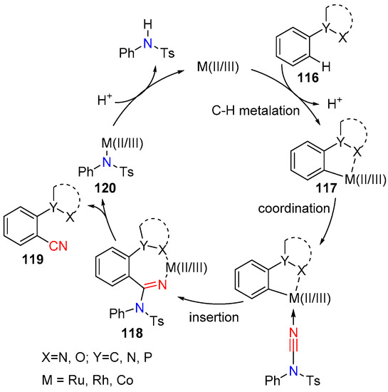 - Ping, Y.; Ding, Q.; Peng, Y. Advances in C−CN Bond Formation via C−H Bond Activation. ACS Catal. 2016, 6, 5989–6005. [Google Scholar] [CrossRef]