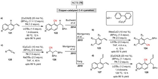 - Yang, Y. Regio- and Stereospecific 1,3-Allyl Group Transfer Triggered by a Copper-Catalyzed Borylation/ortho-Cyanation Cascade. Angew. Chem. Int. Ed. 2016, 55, 345–349. [Google Scholar] [CrossRef] [PubMed]