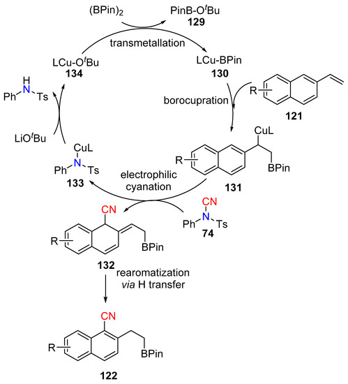 - Zhao, W.; Montgomery, J. Functionalization of Styrenes by Copper-Catalyzed Borylation/ ortho-Cyanation and Silver-Catalyzed Annulation Processes. Angew. Chem. Int. Ed. 2015, 54, 12683–12686. [Google Scholar] [CrossRef] [PubMed]
