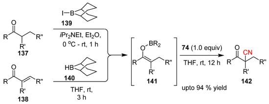 - Kiyokawa, K.; Nagata, T.; Minakata, S. Electrophilic Cyanation of Boron Enolates: Efficient Access to Various β-Ketonitrile Derivatives. Angew. Chem. Int. Ed. 2016, 55, 10458–10462. [Google Scholar] [CrossRef] [PubMed]