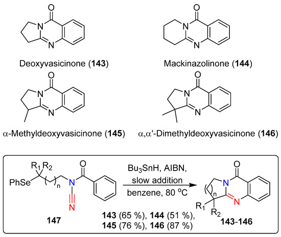 - Larraufie, M.-H.; Malacria, M.; Courillon, C.; Ollivier, C.; Fensterbank, L.; Lacôte, E. Synthesis of natural quinazolinones and some of their analogues through radical cascade reactions involving N-acylcyanamides. Tetrahedron 2013, 69, 7699–7705. [Google Scholar] [CrossRef]
