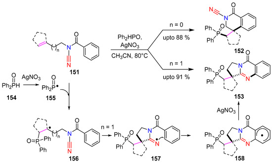 - Zheng, J.; Zhang, Y.; Wang, D.; Cui, S. Silver(I)-Mediated Phosphorylation/Cyclization Cascade of N‑Cyanamide Alkenes for Divergent Access to Quinazolinones and Dihydroisoquinolinones. Org. Lett. 2016, 18, 1768–1771. [Google Scholar] [CrossRef] [PubMed]