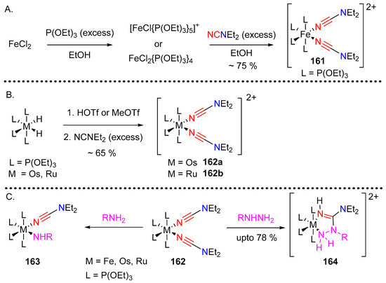 - Albertin, G.; Antoniutti, S.; Caia, A.; Castro, J. Preparation and Reactivity Towards Hydrazines of bis(cyanamide) and bis(cyanoguanidine) Complexes of the Iron Triad. Dalton Trans. 2014, 43, 7314–7323. [Google Scholar] [CrossRef] [PubMed]